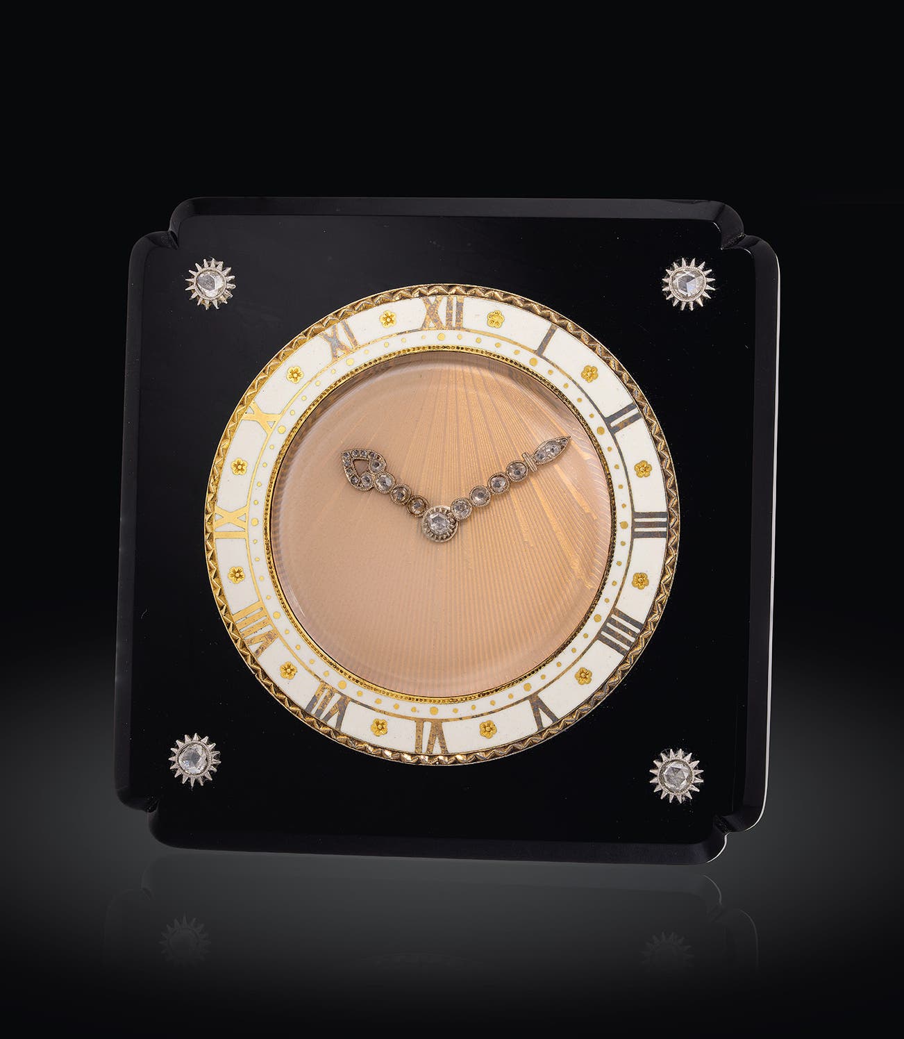 Embodying the opulent style of the Art Deco period, the present clock is a typical Cartier clock from that era. Built with a beautiful square-shaped black onyx frame with chevroned corners, it is further enhanced with rose-cut diamond sunburst motifs. Meanwhile, the enamel hour chapter ring is adorned with gold Roman numerals and spaced by gold floral motifs. This reflects the ancient Chinese philosophy of “round heaven, square earth”, which symbolises a fundamental principle of balance and harmony between the spiritual and material. In contrast to the black onyx frame, the pale peach-coloured guilloché enamel dial gives out a nice warm glow. Like many examples from the same era, the hands are set with rose-cut diamonds, which gives an opulent touch to the clock. Despite unsigned on the front nor dial, the clock consists of all the features of a Cartier art deco timepiece.