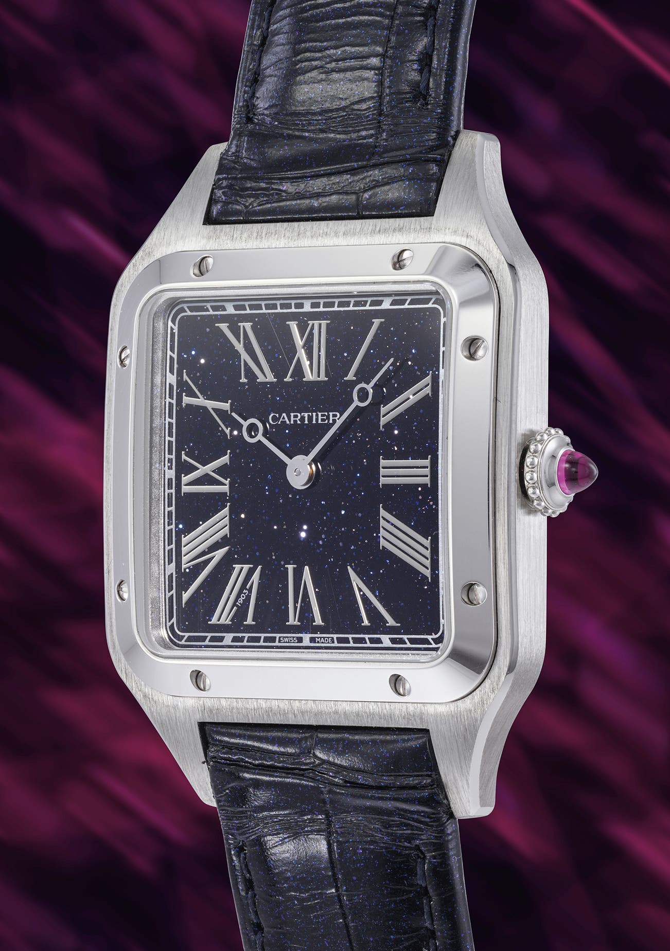 Released in 2025 as a limited edition of 100 pieces exclusively for the French market, the present Santos - Dumont features a stunning aventurine dial, giving the watch an almost cosmic look. Crafted in platinum, this timepiece is full of small but meaningful details such as the ruby cabochon on the crown, the discreet "1903" signature on the 7 o'clock hour marker and the caseback engraving "La Baladeuse Champs Elysées, 1903" alluding to the year that Alberto Santos Dumont landed in front of his house in Paris.