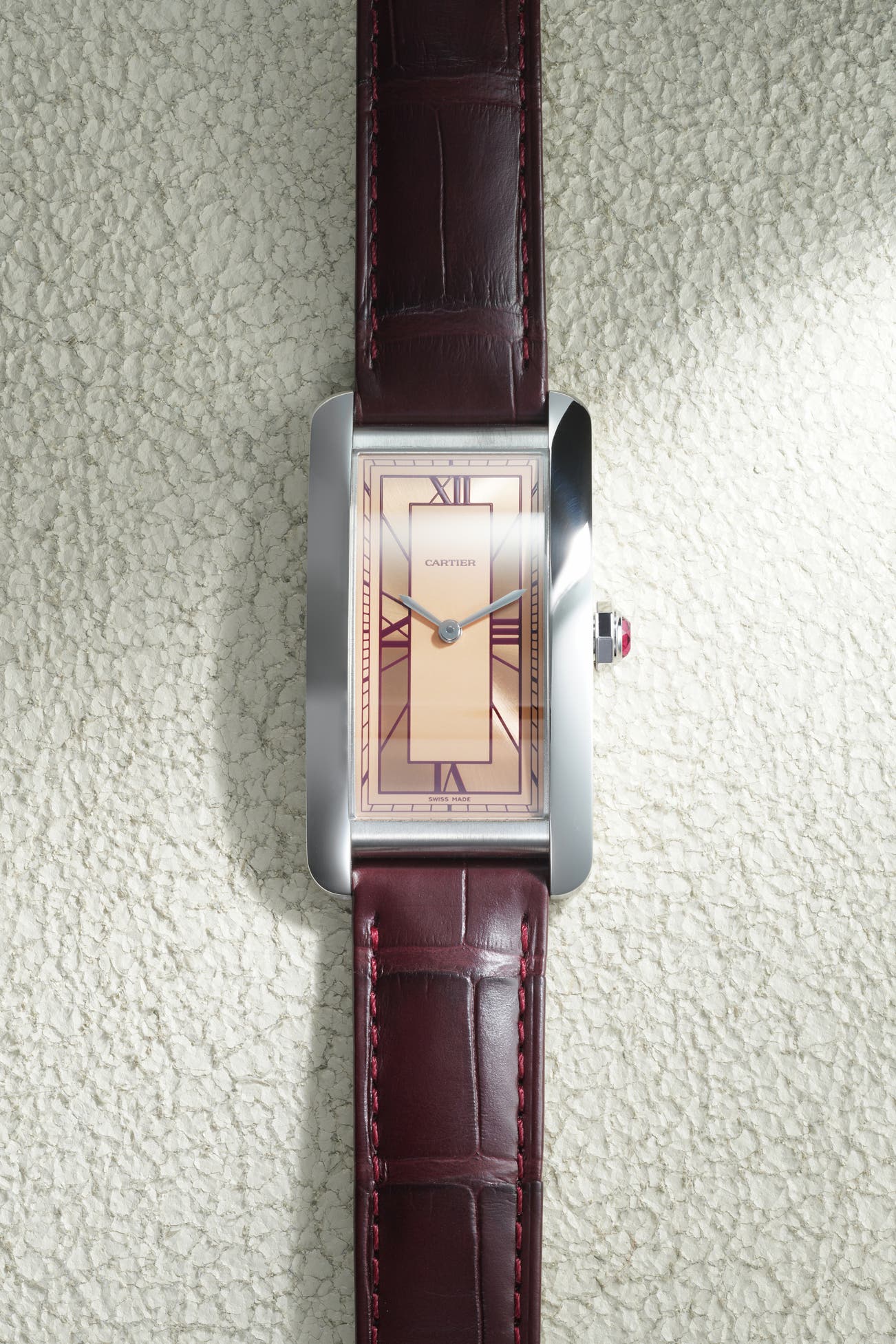 - The railroad minute track moves to the outer edge, most numerals are removed, and the remaining four Roman numerals sit within an Art Deco frame over a radially brushed background. This new version is a refined, contemporary take that sharpens the Tank’s elegance while amplifying its architectural character—cleaner lines, stronger contrasts, and a cohesive palette that elevates legibility and presence on the wrist, all while honoring the model’s heritage with modern updates.