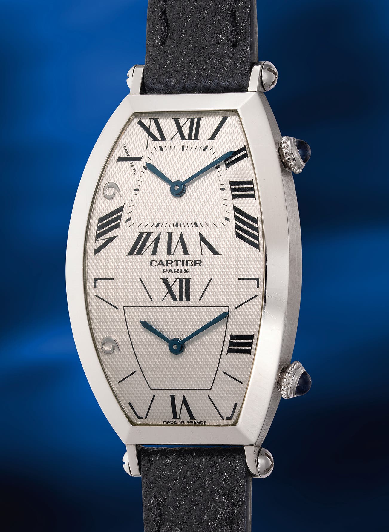 A very rare and attractive limited edition platinum tonneau-shaped dual-time wristwatch with guilloché dial and certificate, numbered 38 of a limited edition of 99 pieces made to commemorate Macau’s handover to the People’s Republic of China