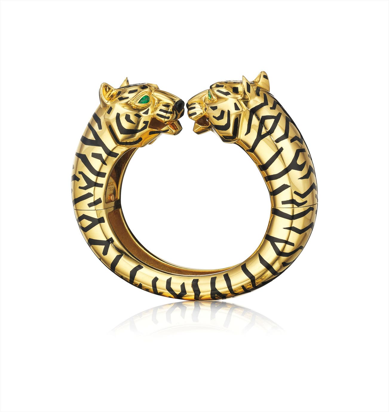 Designed as a polished gold double headed panther bangle, accented by pear-shaped emerald eyes and black enamel detail, mounted in 18K yellow gold, diameter 2 1/4 inches.