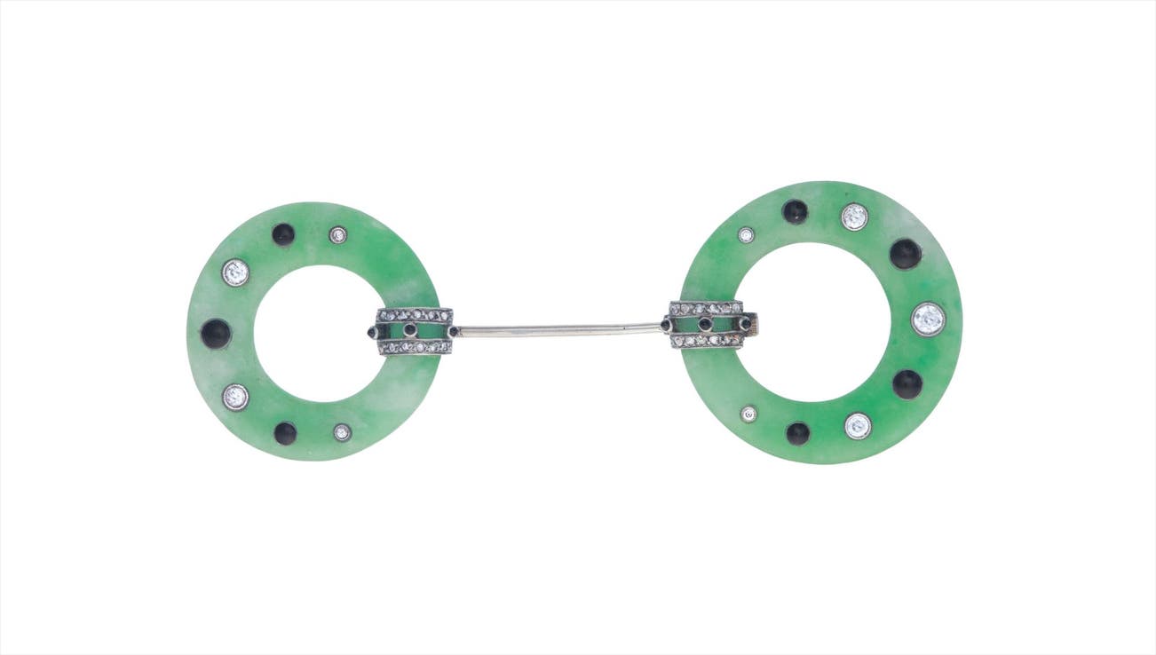 An Art Deco Jade, Black Onyx, and Diamond 'Jabot' Brooch