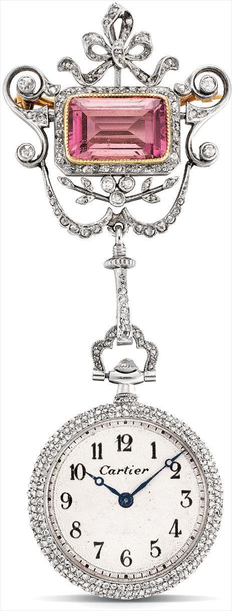 A very fine, rare and ultra-thin platinum, pink gold and diamond-set openface pendant watch, suspended from a rectangular-cut imperial garland pink topaz brooch