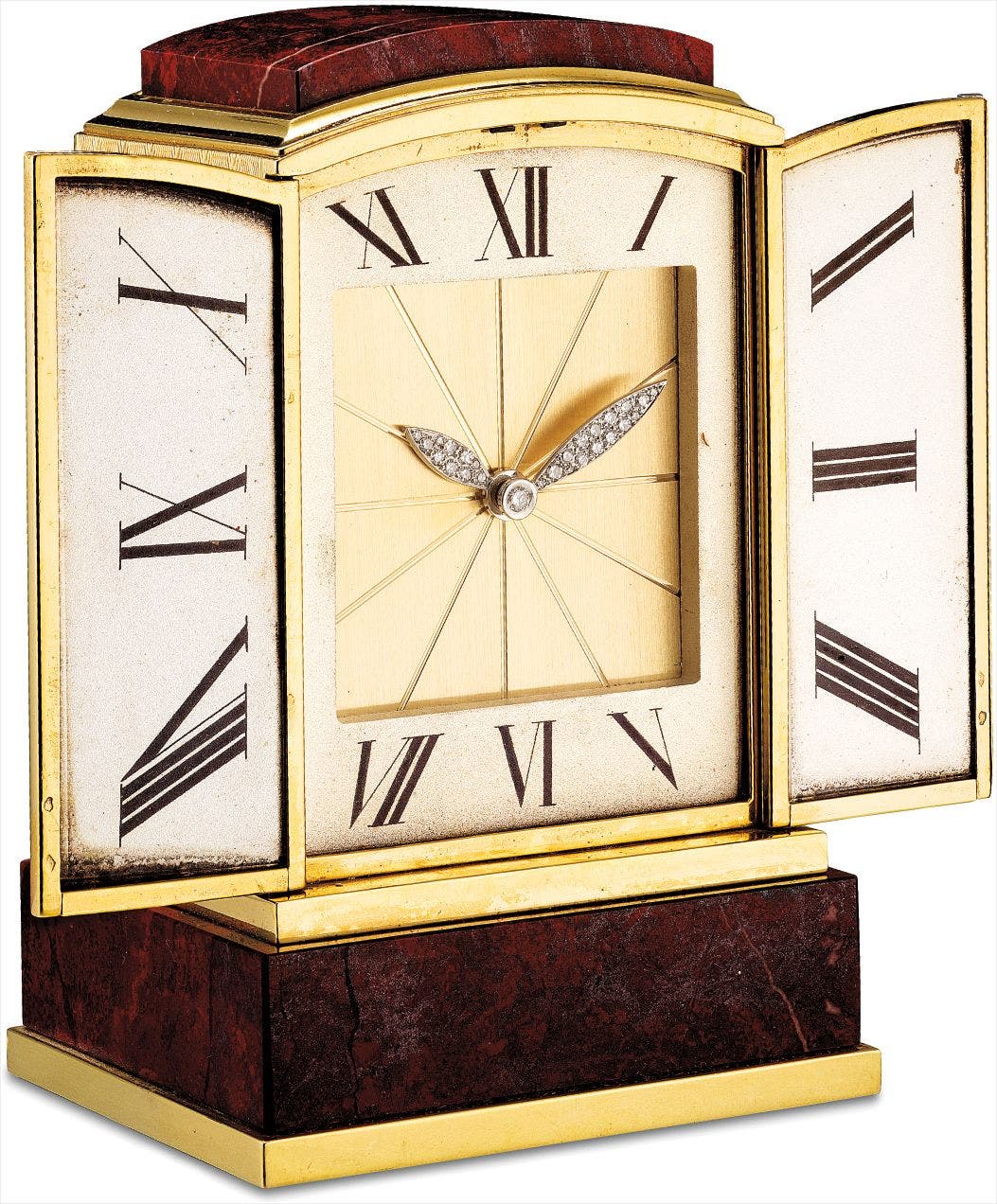 A very fine and extremely rare yellow gold, platinum and diamond-set miniature shutter clock with hardstone mount and original fitted presentation box