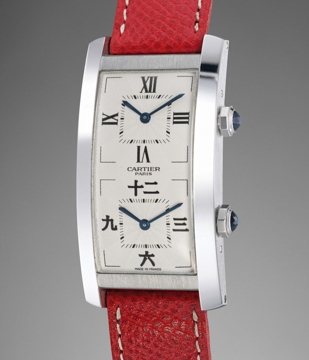 Cartier's luxury objects, whether jewelery or timepieces, were always designed for their elite clientele: the nobleman, the driver, the pilot, the sportsman, or the world-traveler. To reflect the demands of the latter, Cartier has since its earliest days produced watches with multiple time zones; even as early as 1927, they created a custom pocket watch, likely for a distinguished patron, crafted in platinum and displaying three separate time-zones. The first Cintrée was released six years earlier, in 1921, as the largest and boldest variation of Cartier's line of Tank watches. Over the next nine decades, it has been produced in small batches, with a variation of materials and dial architecture, but never losing its curved, elongated form. Indeed, it was most recently released in an updated form at le Salon International de la Haute Horlogerie de Genève in 2018 to much fanfare from both vintage and modern enthusiasts of Cartier.