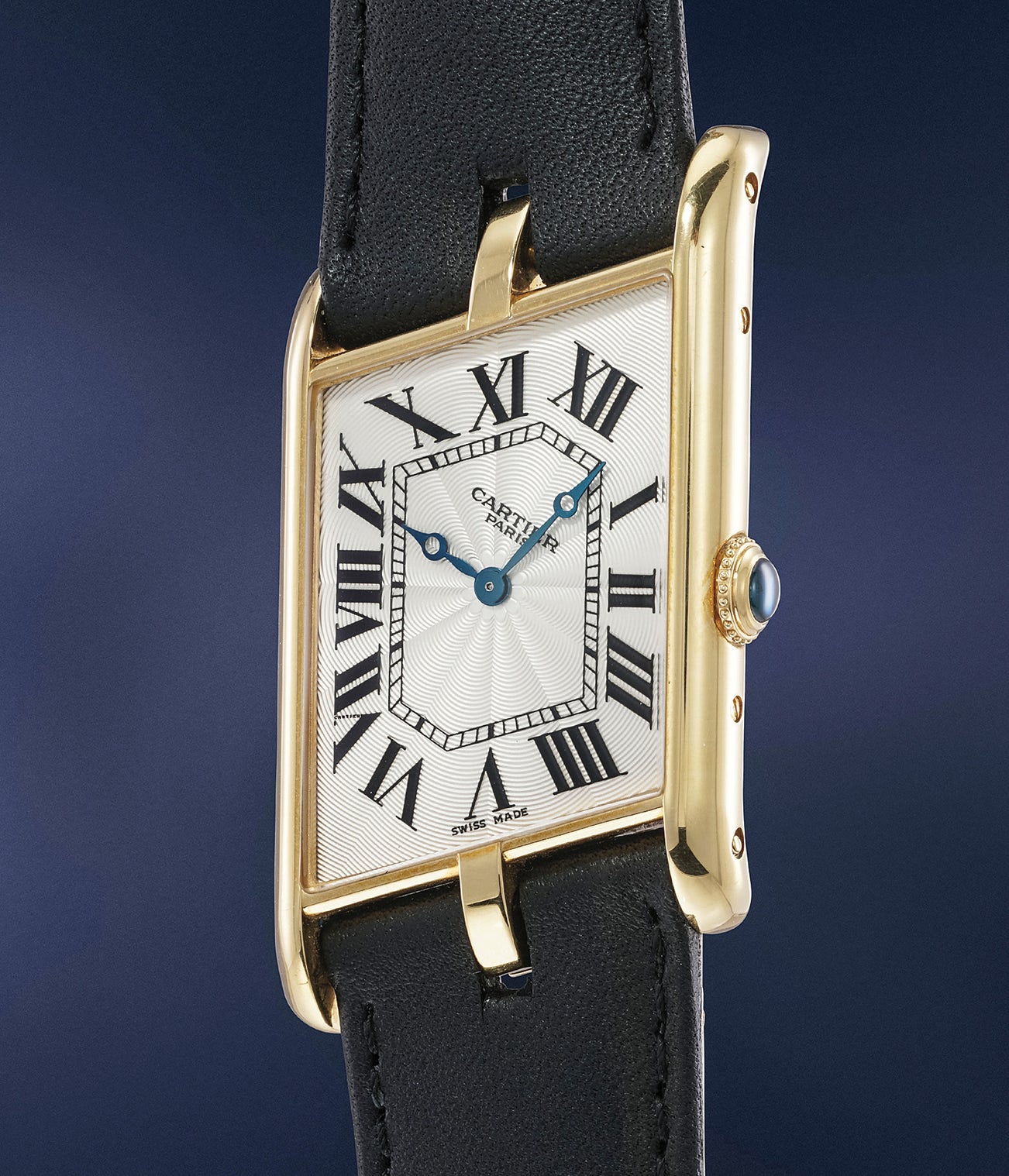 Known as the "Jumbo" due to its larger case size, this Tank Asymétrique was made in a limited edition of 150 examples, and displays a beautiful guilloché dial. Preserved in excellent condition, it displays crisp hallmarks on the case back.