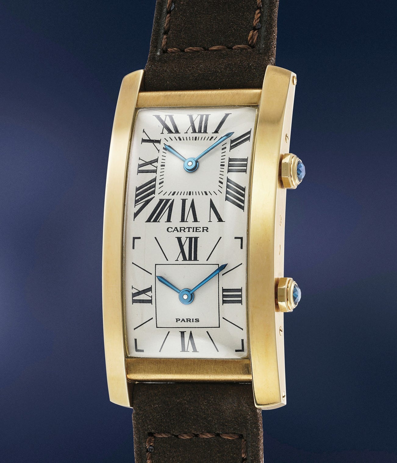 The present Tank Cintrée from 1990 is a marvel of finesse and design ingenuity. To create a dual time watch, Cartier decided to house two mechanical movements into one case and a dial split in two sections for the time indication, giving the watch a particularly vibrant look.