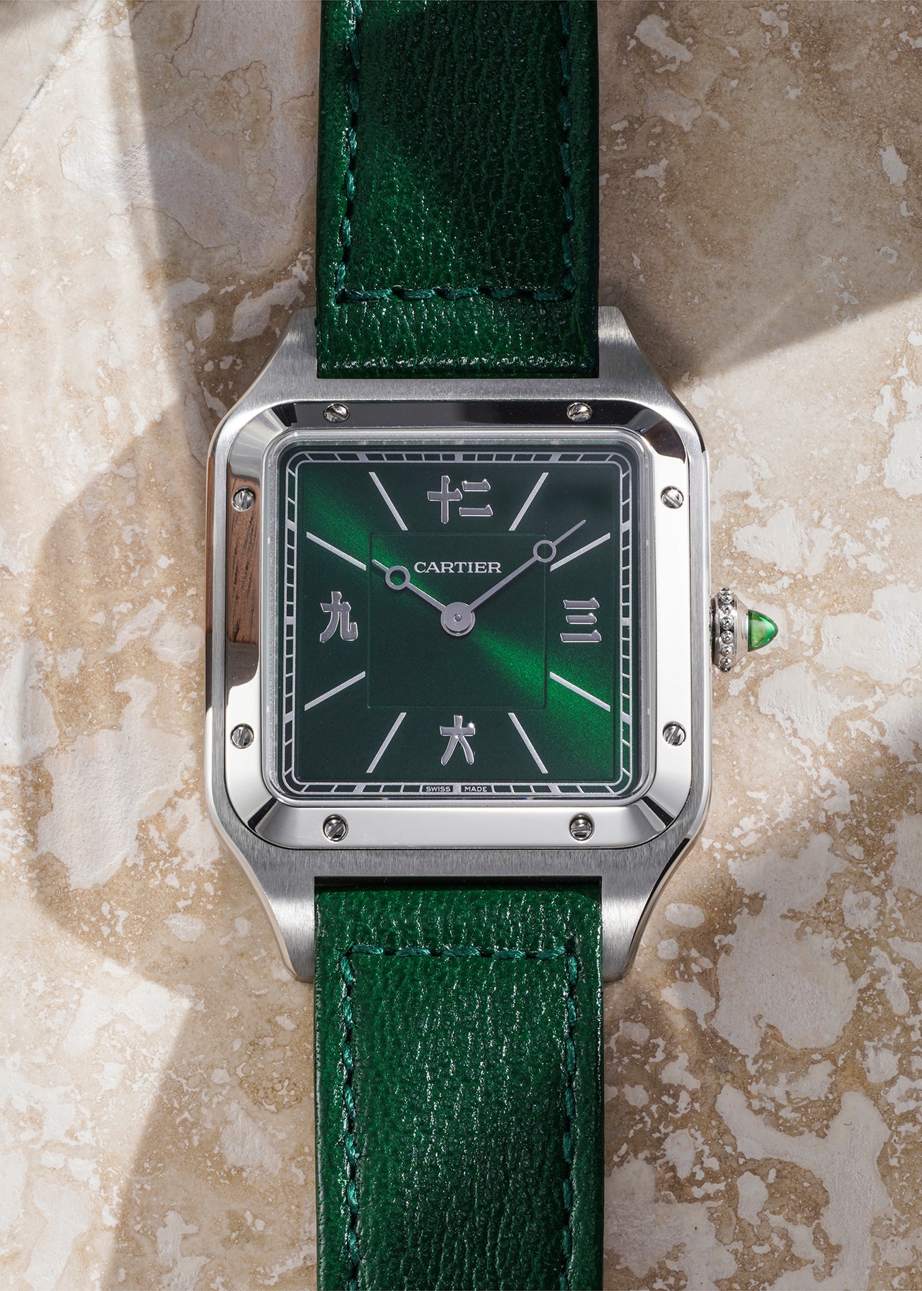 An extremely rare, unusual and attractive stainless steel wristwatch with sunburst green dial, Chinese numerals, emerald-set crown, certificate and presentation box, part of a 50 piece limited edition