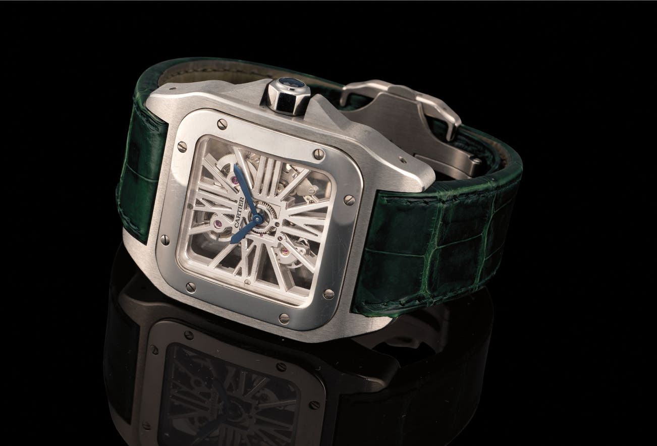 Since 1904, Cartier has produced many variations of the Santos watch, making the model an instant classic within the watch community. The present watch, the Santos 100 rendered in palladium, is a unique interpretation of the now iconic watch. It features a skeletonized dial and case back, which gives the viewer a peek into the exceedingly complex process in which a watch is created.