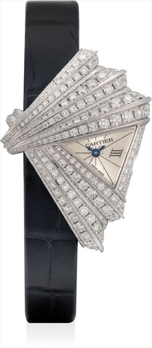 A lady's fine and elegant white gold and diamond-set fan-shaped wristwatch