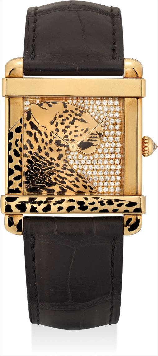 A fine and rare yellow gold, diamond and enamel-set limited edition square wristwatch