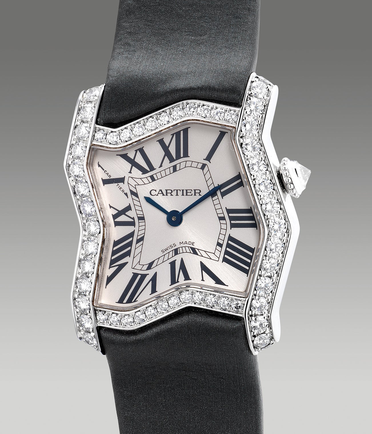 A lady’s very fine, unusual and rare limited edition white gold and diamond-set asymmetrically-shaped wristwatch with certificate and presentation box, numbered 47 of a limited edition of 200 pieces