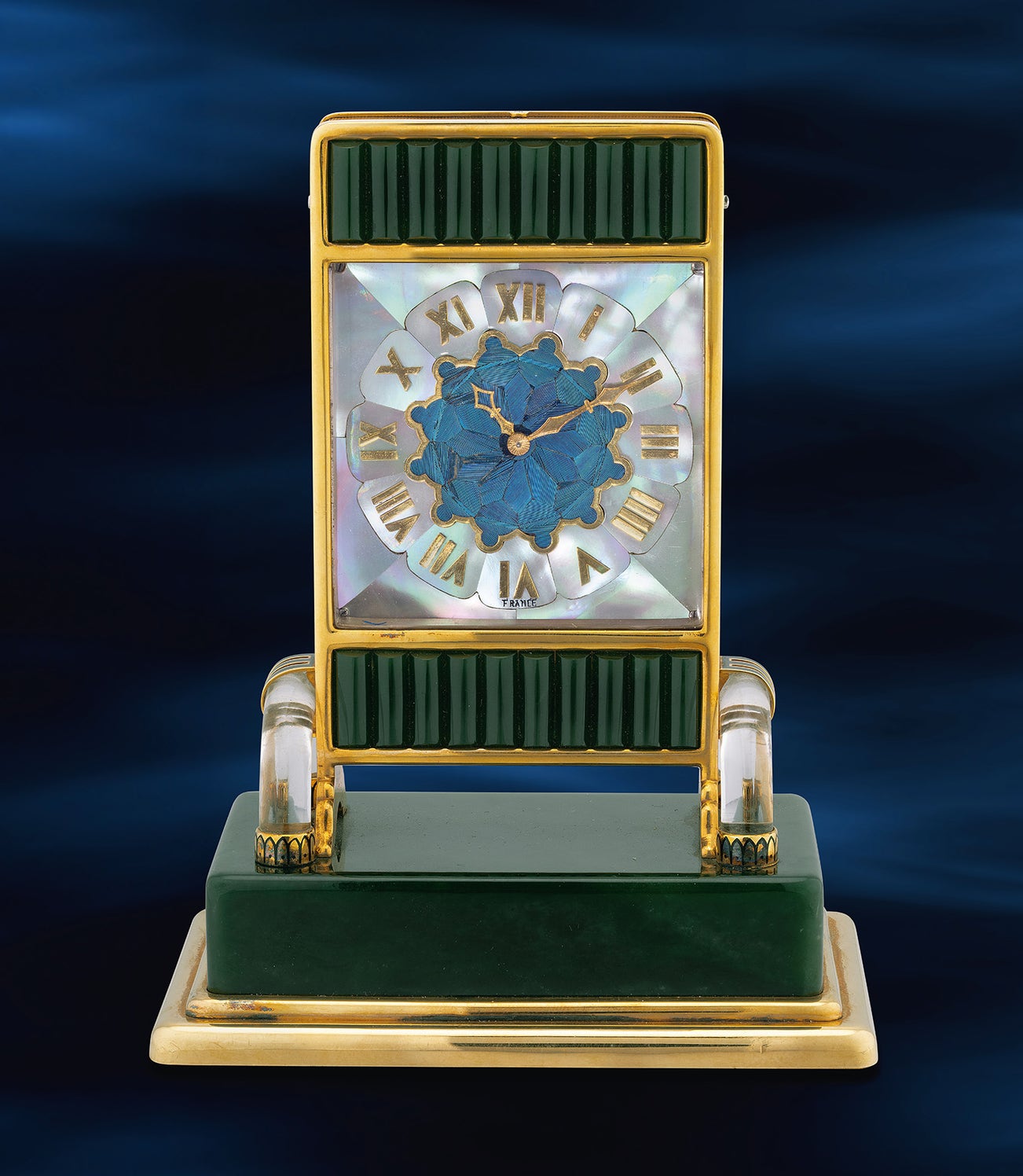 Crafted from Cartier Paris as denoted on the dial, the impressive marquetry mother-of-pearl floral motif reflects a touch of femininity in contrast with the dark green jade. Extremely elegant, Cartier topped it off with a rare craft to this already stunning clock. Tian-Tsui, is a Chinese craft featuring kingfisher feathers. For 2,000 years, the Chinese have been using the iridescent quality of these blue feathers of the majestic bird as inlay for fine art objects, panels and screens. Its unique electric blue sheen from the bird achieves a vivid colour that no enamel can replicate. An extremely painstaking artisanal technique that demands the most skilled craftsmen, back in the days Cartier was able to deliver this rare trade in their Parisian workshop.