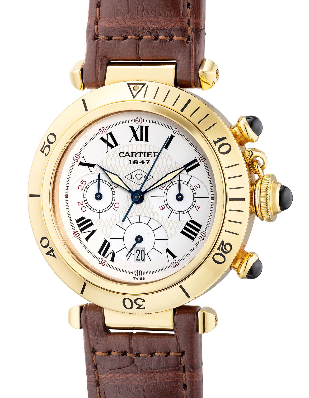The present example from circa 1997 encased in 18K yellow gold features a chronograph function with date and is powered by a quartz caliber. Furthermore, inscribed with "I Heart C" on the dial, the present example belongs to an employee's only edition launched for the 150th anniversary of Cartier, making the present example rare and unusual.