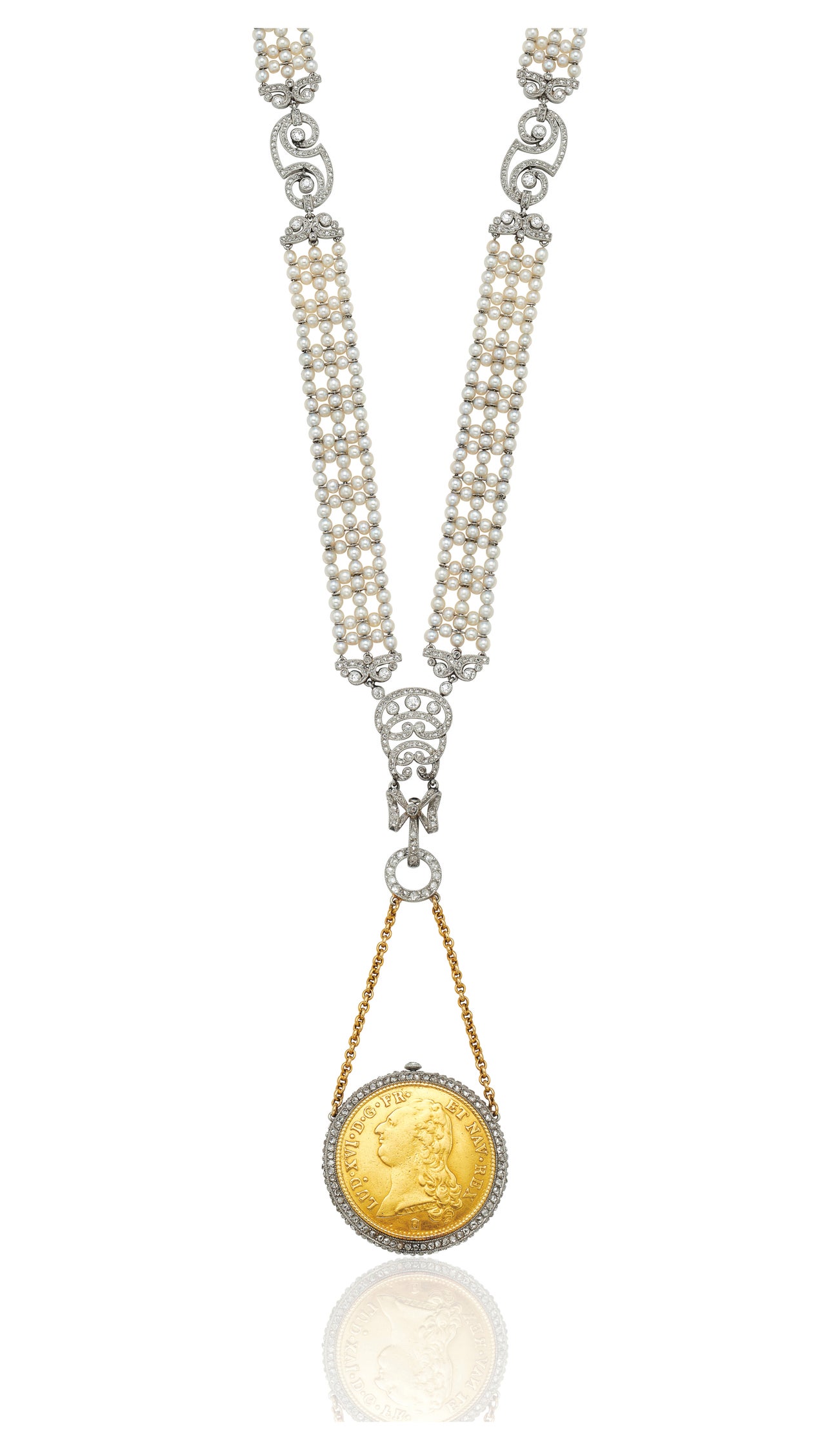 A Diamond, Seed Pearl, Louis d’or Coin, Platinum and Gold Sautoir Pendant Watch