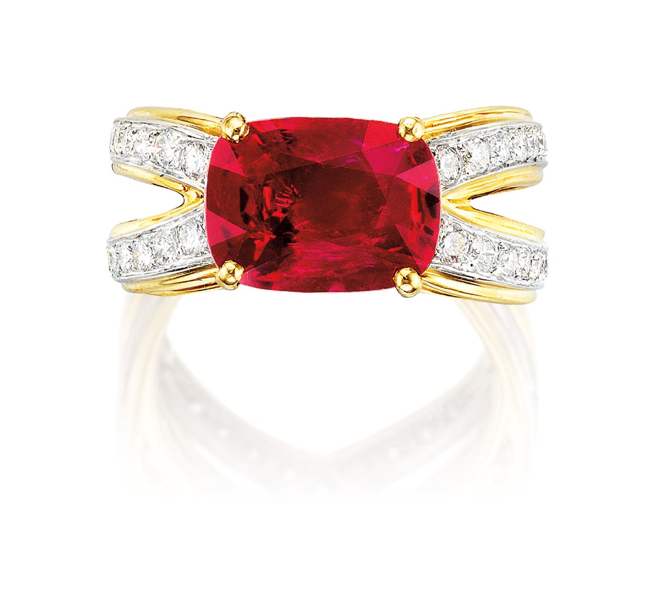 One cushion-shaped ruby, 4.34 caratsBrilliant-cut diamonds on split shankPlatinum and 18 karat yellow gold(4.34-carat Ruby)