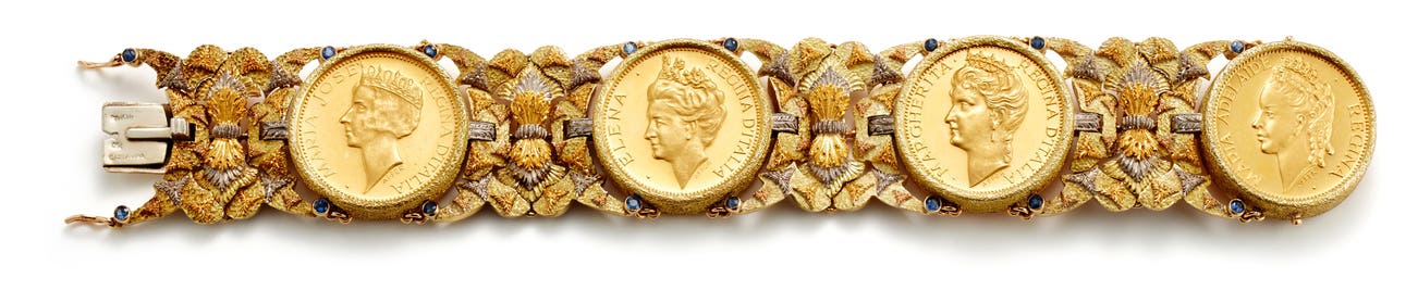 A Sapphire, Coin and Tricolored Gold Bracelet