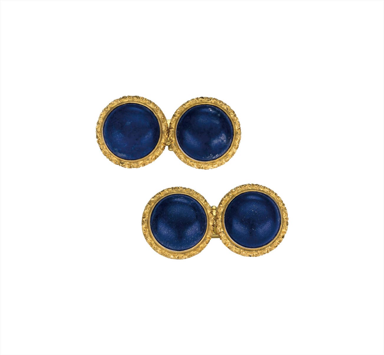 Each designed as a cabochon lapis lazuli set within a textured gold surround, to the similarly designed link, mounted in 18K yellow gold, length 5/8 inch.