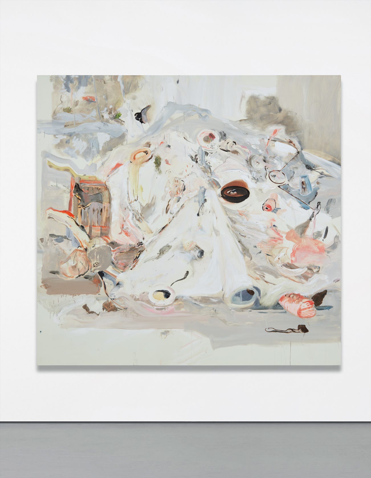 In this instance Brown faintly recalls lavish banquet still-life paintings of the 17th century that, through sight, were intended to arouse synesthetic convulsions of touch, taste and smell. We see the intimation of a discarded fork to the bottom right hand side, above what can be read as a block of pink meat. Further inspection might suggest that the swathes of billowing white triangulate to make a central tablecloth. We find ourselves caught in the beautiful havoc of a deconstructed, dining room interior – perhaps ‘the end’ of a dinner party where the texture of Brown’s brush entices the senses as much as the delectable pink food items scattered for our scopophilic pleasure.