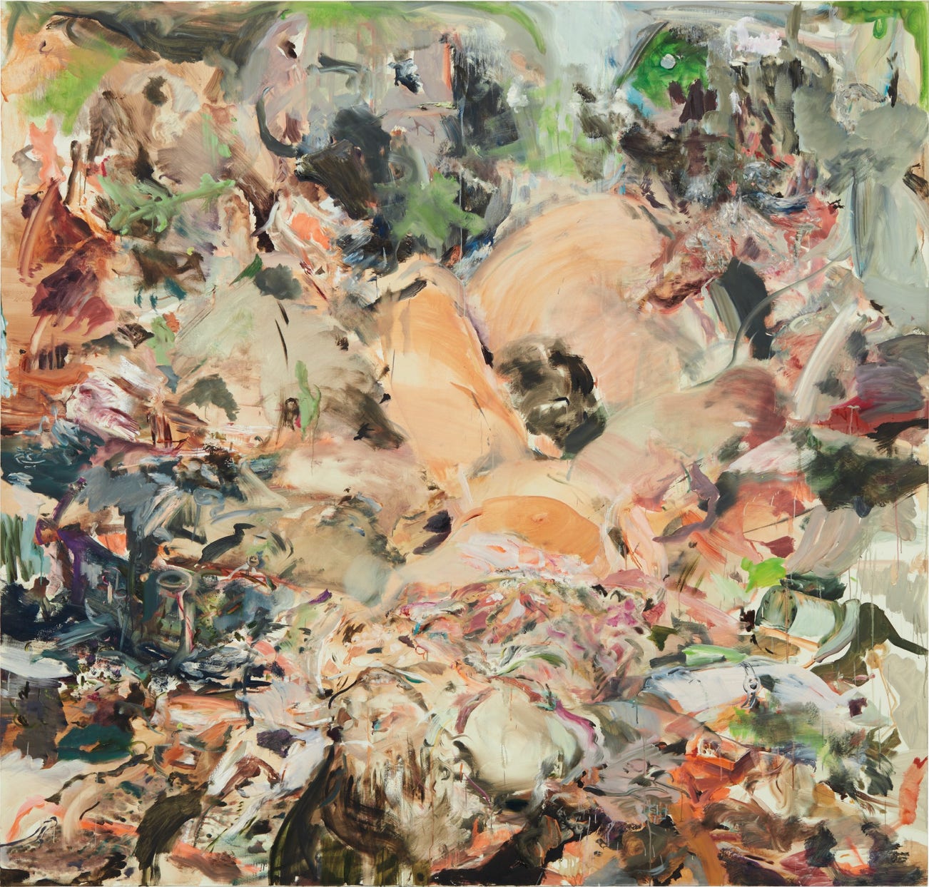 Cecily Brown’s celebrated mastery of painting is captured within the explosion of bold and gestural brushwork in the rich tapestry of depth, colour and form evident in Skulldiver II. This monumental canvas acts as an encyclopaedic display of the physical possibilities of the medium, a showcase of painterly experimentation, control and emotion. Painted in 2006, Skulldiver II is an expressive celebration of sex, a consuming motif which has frequented the artist’s oeuvre since the 1990s. For Brown, sexuality becomes enacted directly in the application of paint, as the artist captures a moment of raw and chaotic pleasure which is simultaneously depicted as a moment of beauty. In the present work, Brown constructs a complex composition, drawing upon a rich palette of warm yellow and pink fleshy hues to transport the writhing figures to the front of the enigmatic pictorial field. Exhibited at Brown’s prolific exhibition in 2008 at Gagosian Gallery, New York, three sister works from the Skulldiver series were exhibited alongside the present work; Skulldiver III (Flightmask) is now housed in the Museum of Fine Arts, Boston. Exemplary of the series, the present work vibrates with carnal lust, consuming the viewer with the power of ecstasy.