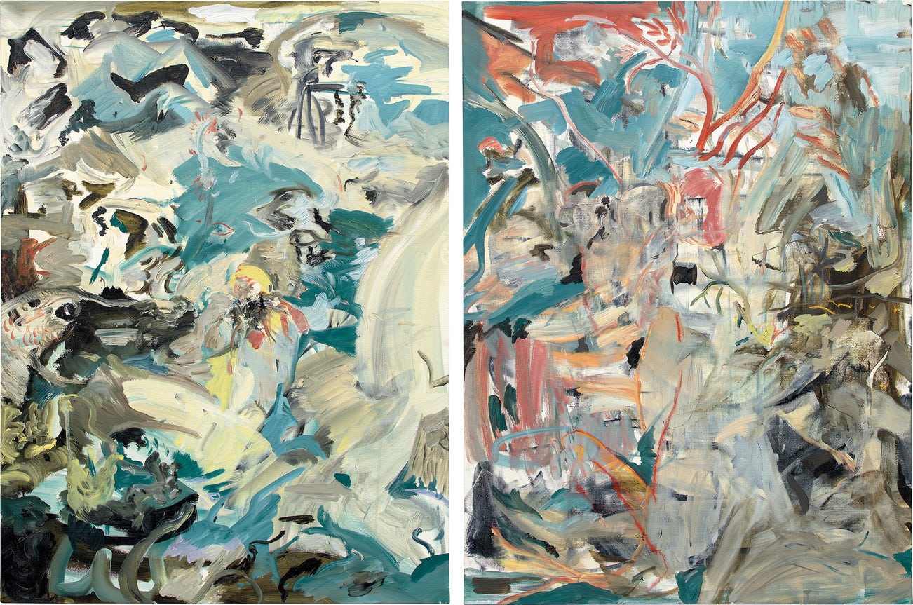 Bisecting the image in two separate entities, Girl Eating Turtle Dove establishes a physical dynamic whereby one canvas morphs into the other, thus producing a diptych where vibrant tornadoes of swirling pigment occur alongside lyrical outbursts and bright accentuations. Quasi-figurative, Girl Eating Turtle Dove displays a dizzying array of marks and gestural inscriptions that result in a rebelliously enigmatic pictorial field. It namely evokes sky and land, indicated by its moody blues and greens, while simultaneously alluding to a strong sense of sensuality. A diptych endowed with a life of its own, the present work lives as proof that close to none have interpreted the medium of painting with such virtuoso as Cecily Brown.