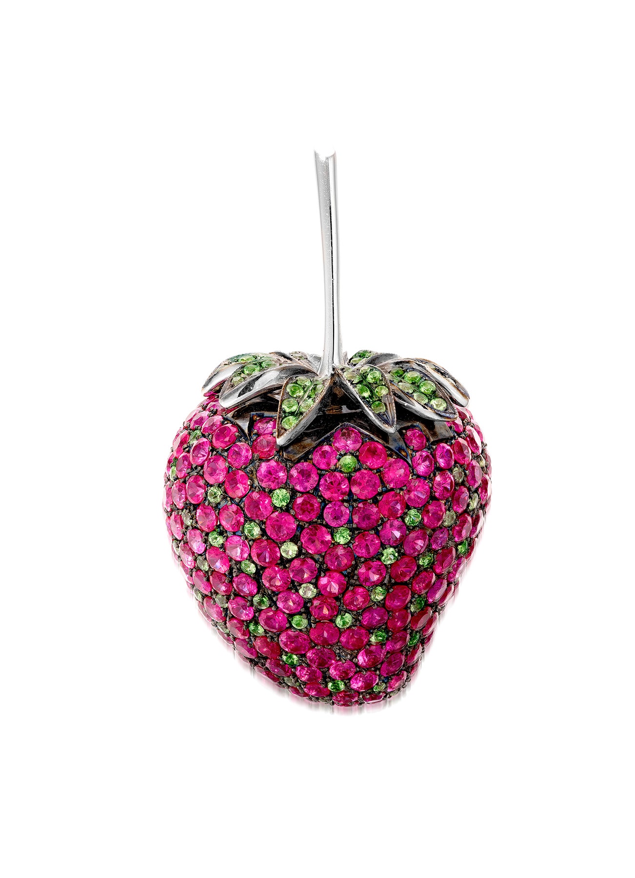 Designed as a strawberry, set with circular-cut rubies and tsavorite garnets, mounted in white gold and oxidized white gold, signed Cellini, length and width approximately 44 mm and 27 mm respectively.