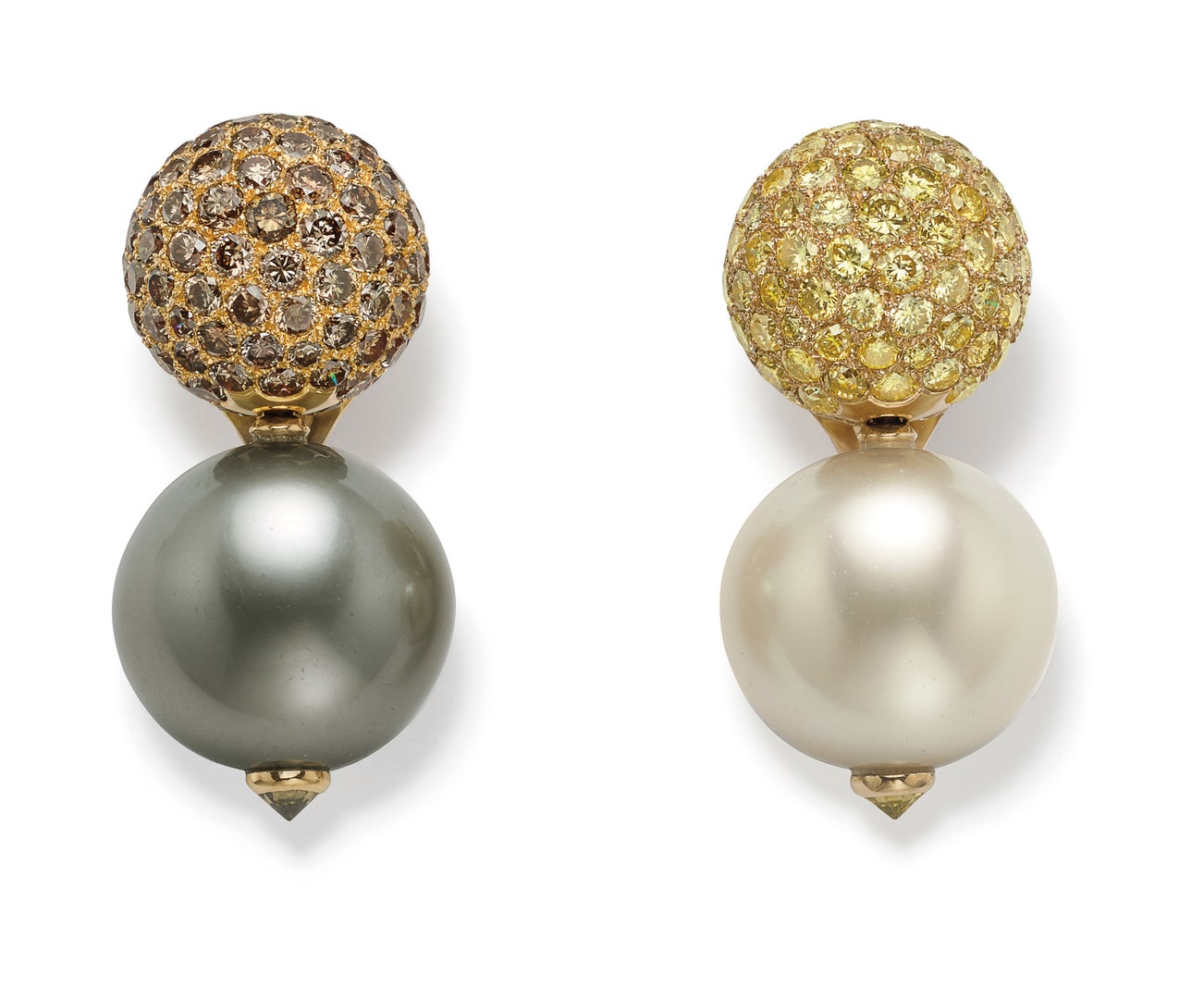 A Pair of Cultured Pearl, Colored Diamond and Gold Earrings