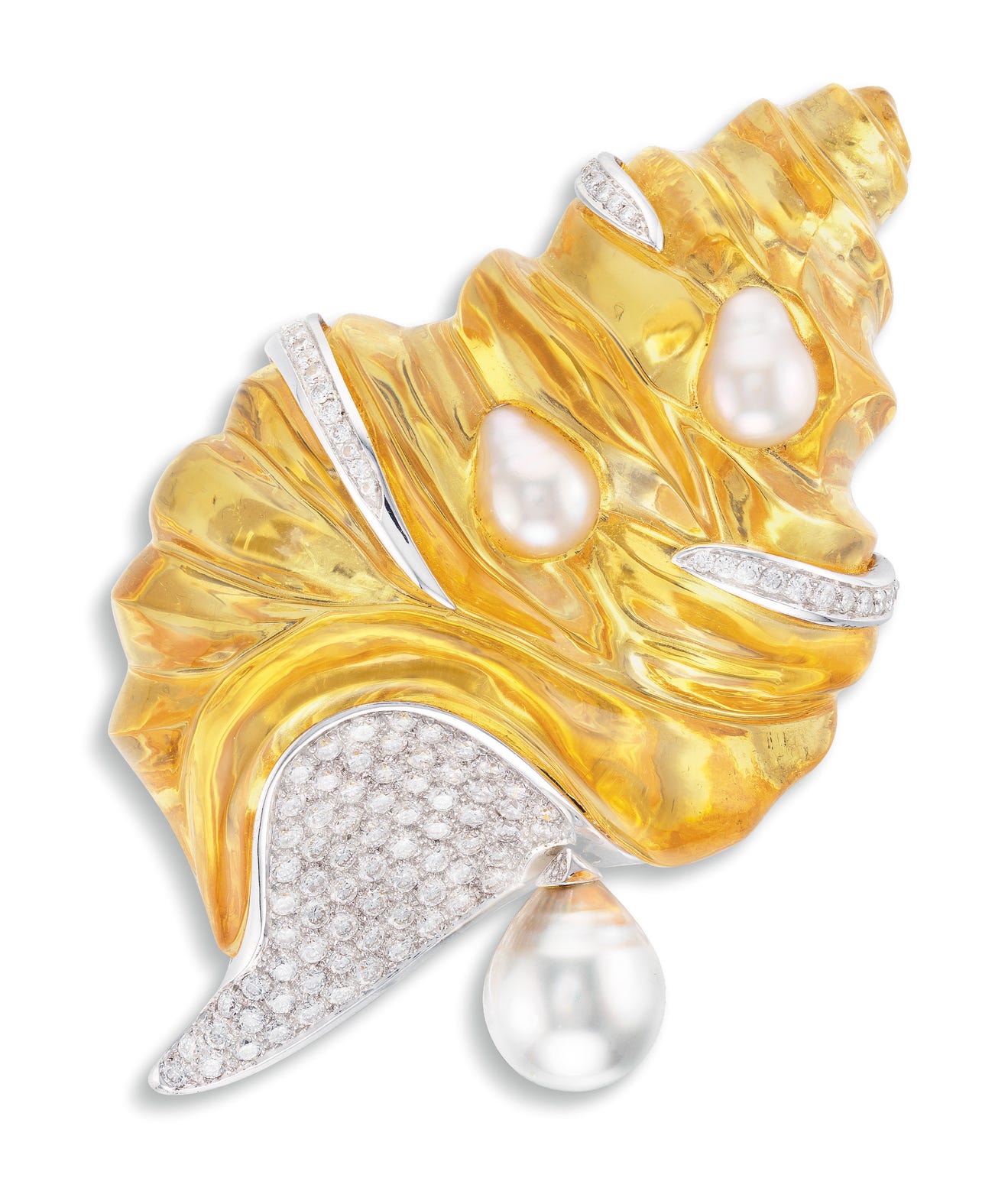 Carved yellow lucite 'seashell', decorated with numerous brilliant-cut diamonds, totalling approximately 2.00 caratsFurther enhanced by two semi-baroque and one drop-shaped cultured pearls, <em>measuring approximately 15.38 x 11.65 to 10.21 x 6.79mm </em>18 karat white gold