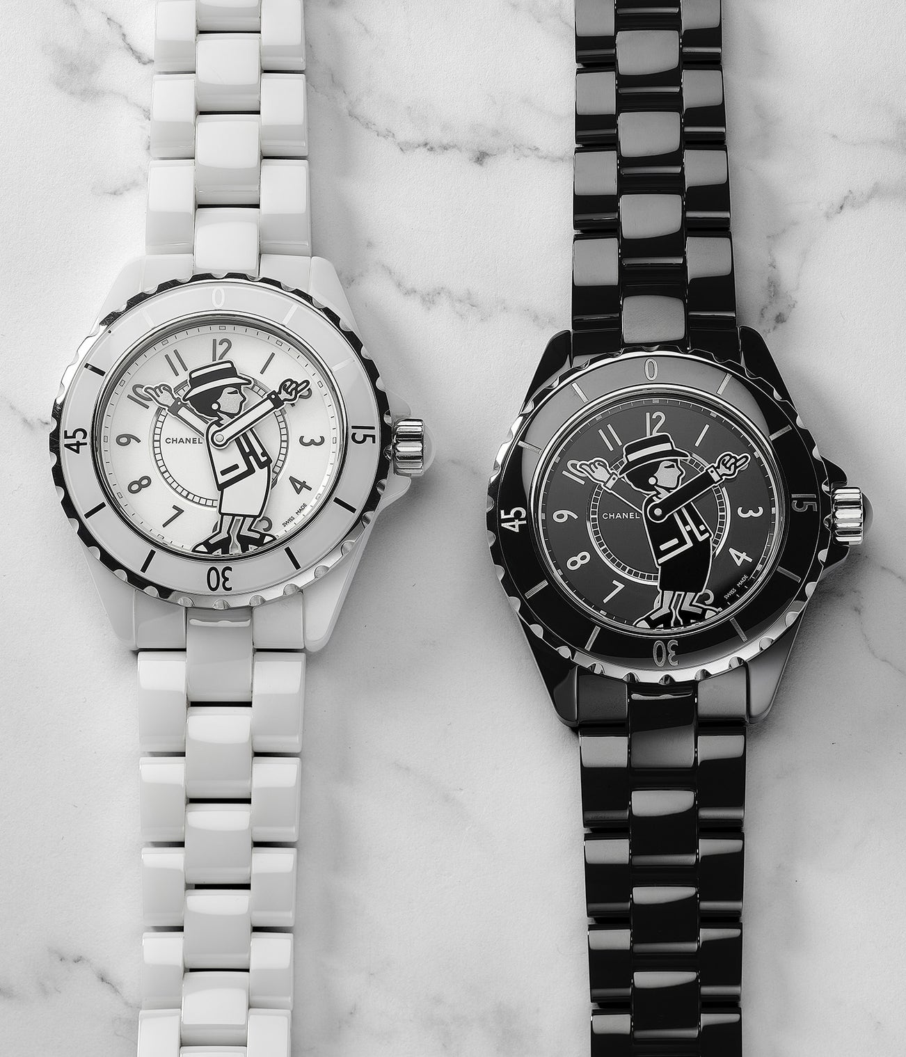 To commemorate 17 years of J12, Chanel launched a couple of limited edition of 555 pieces for each white and black ceramic. An instant hit, the dial depicts Mrs. Coco Chanel in cartoon form with articulated hands telling the time. The present lot comes as a set with a white and black ceramic example, both of which are presented in excellent overall condition and complete with the full set of accessories.