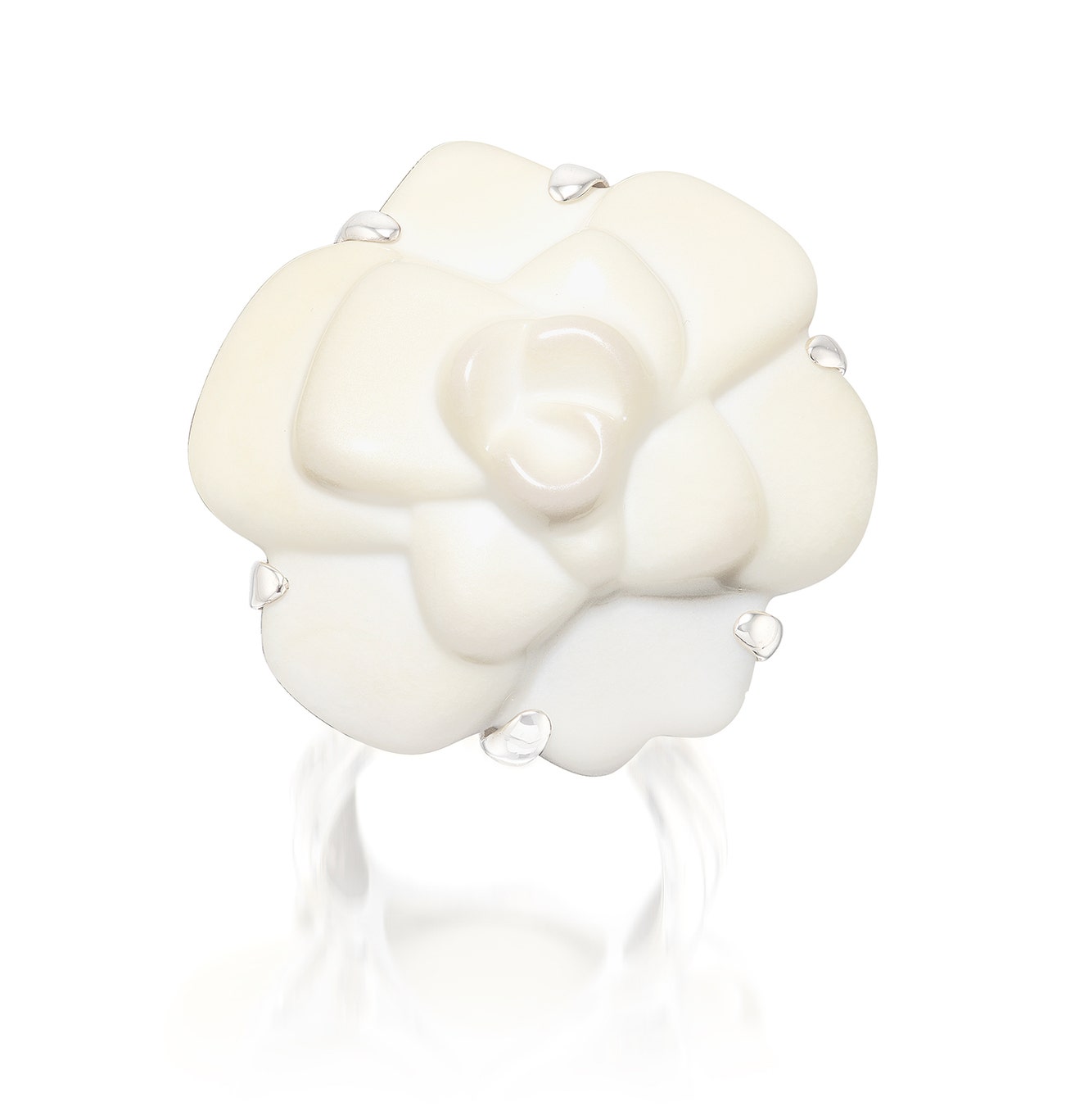 Set with a carved white agate camelia flowerhead on a woven white gold ring band, mounted in white gold, signed Chanel, numbered, French assay mark, size 5¼, case stamped Chanel.