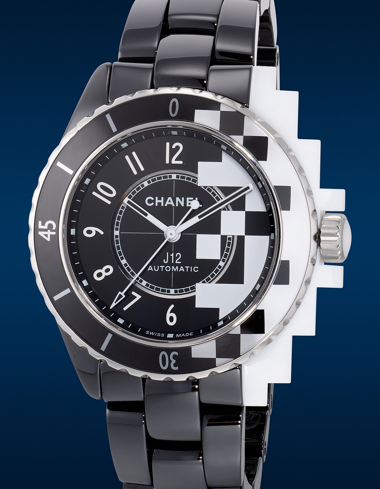 - The J12 Cybernetic is one of the most intriguing design from the collection. A clash of black and white ceramic, the futuristic pixelated motif gradually transit from dark to light like an eclipse of the moon. Visually striking, the motif even extends to its case design where the crown side boast a pixelated shaped as well.