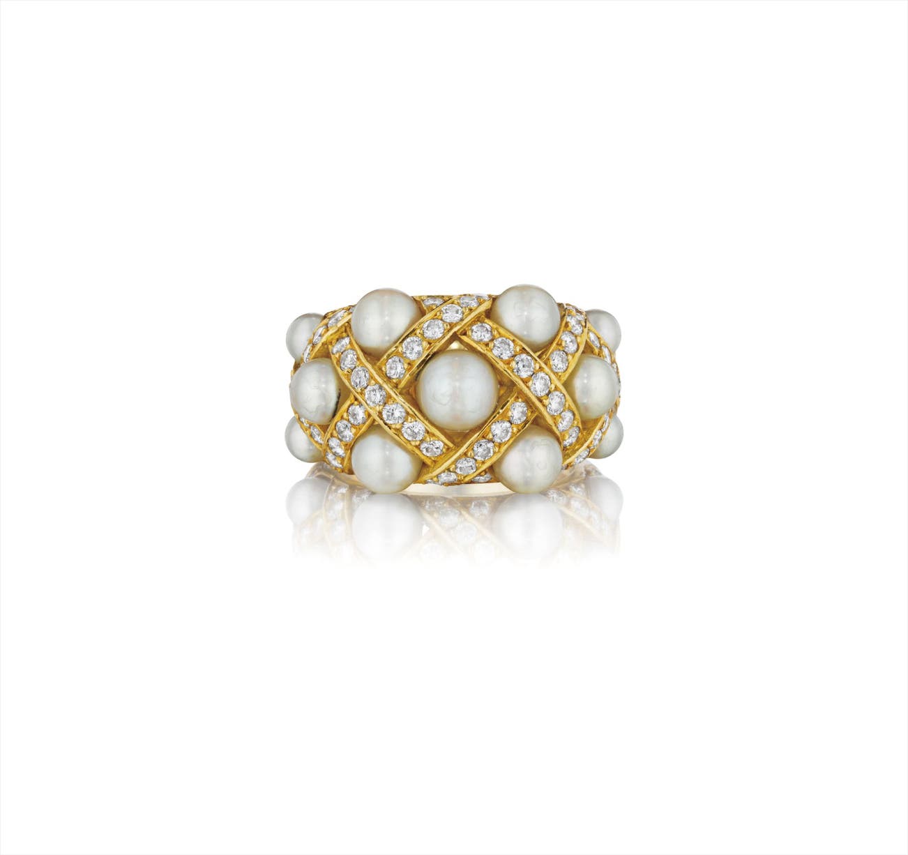Designed as a wide bombé band, set to the top with cultured pearls, within woven pavé-set diamond accents, mounted in 18K yellow gold, size 5 3/4.