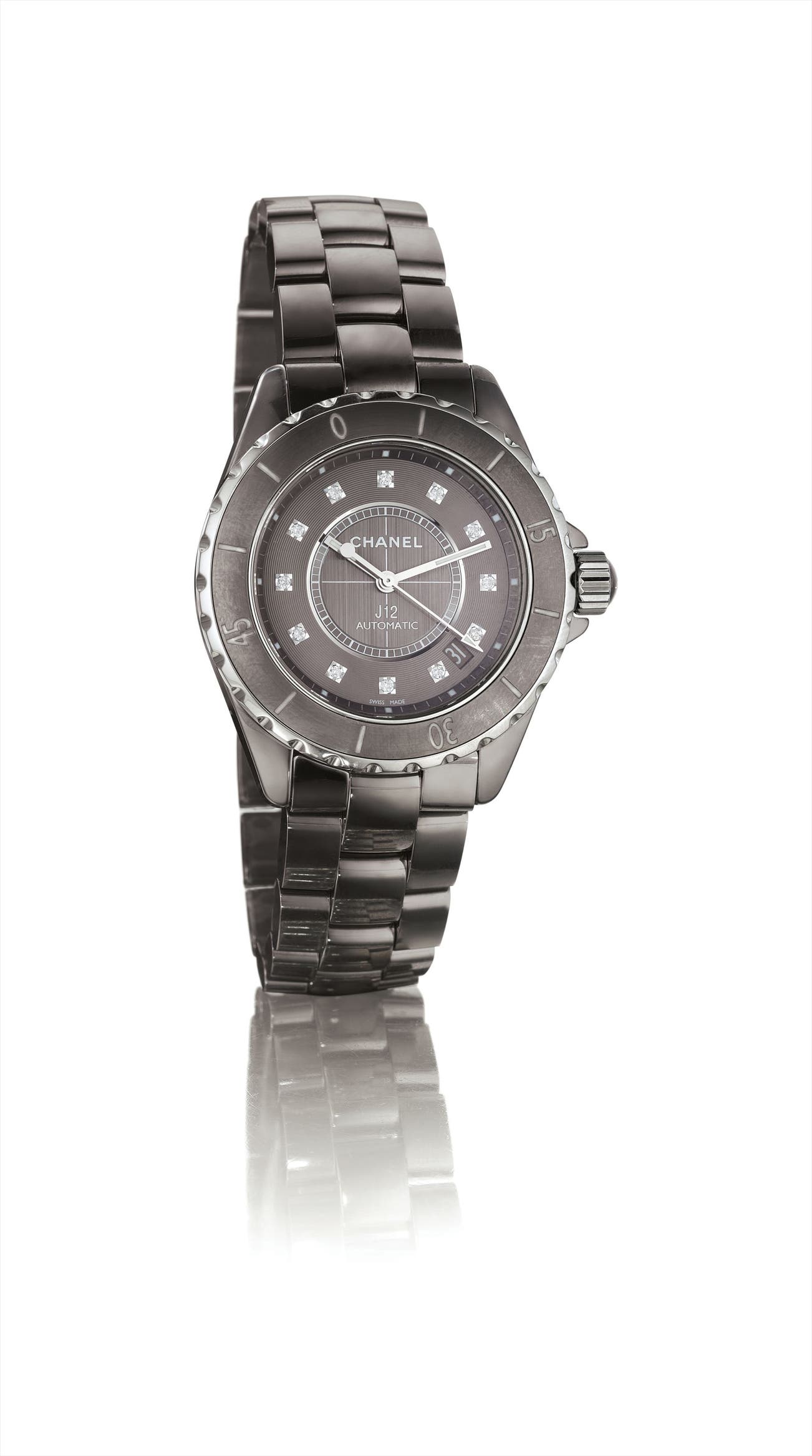 Of mechanical movement, the circular gray dial with diamond markers and silver luminescent hands, with date aperture between 4 and 5 o'clock, and black ceramic bezel, case, and band, mounted in stainless steel, diameter 2 inches.