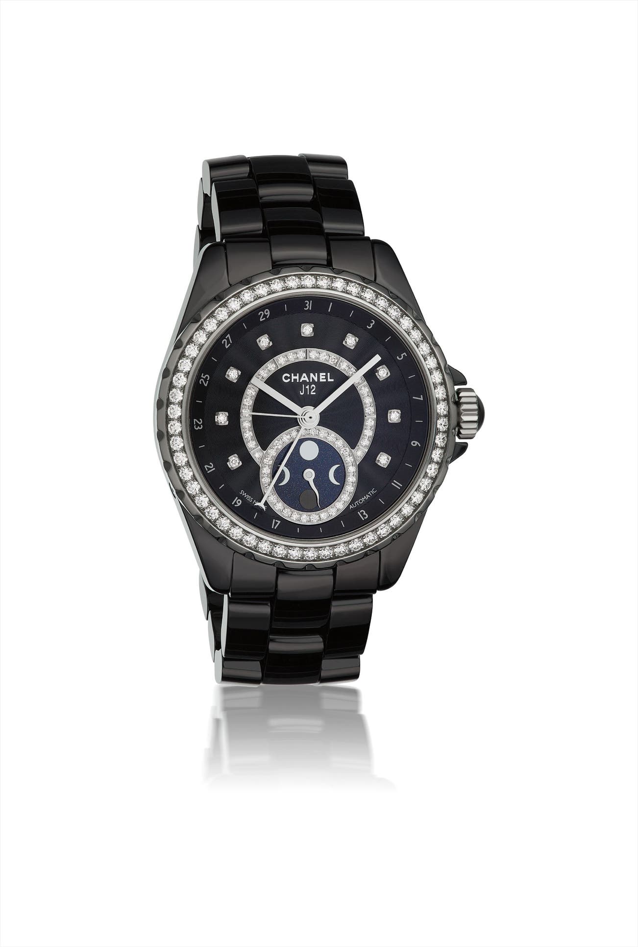 Of automatic movement, the circular black dial set with silver hands and diamond markers, with subsidiary dial for moon phase, within a circular-cut diamond bezel, to the black ceramic case and band, mounted in stainless steel, diameter 2 inches.