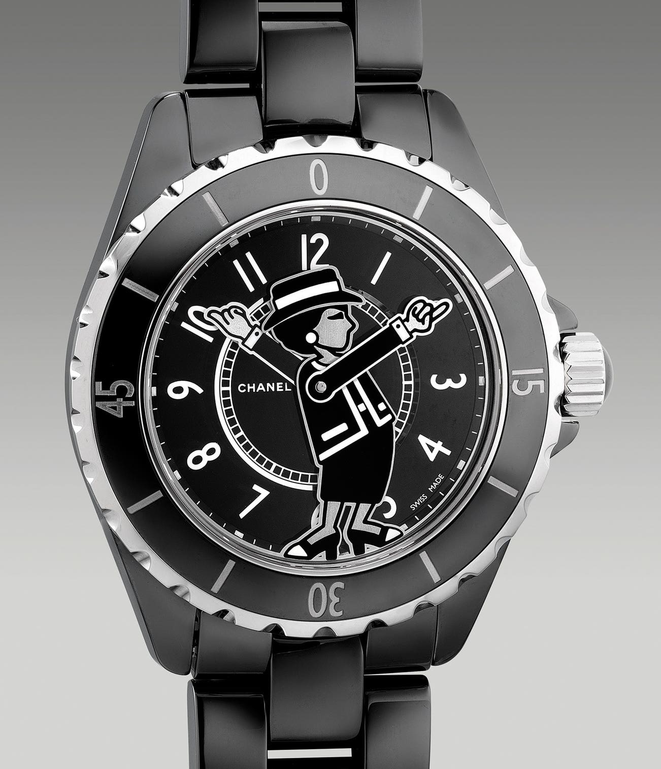 To commemorate 17 years of J12, Chanel launched a couple of limited edition of 555 pieces for each white and black ceramic. An instant hit, the dial depicts Mrs. Coco Chanel in cartoon form with articulated hands telling the time. The present example in black ceramic is presented in excellent overall condition and is complete with the full set of accessories.