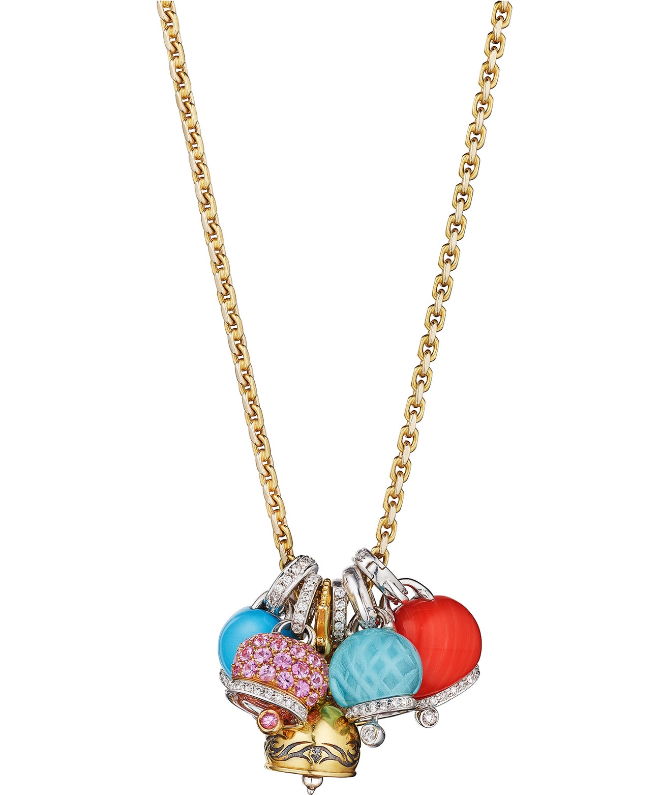 Comprising 6 bell pendants, set with carved coral, topaz and turquoise, decorated with round pink sapphires and brilliant-cut diamonds, mounted in 18K gold, chain length measuring approximately 23 inches, signed Chantecler, with Italian assay mark.