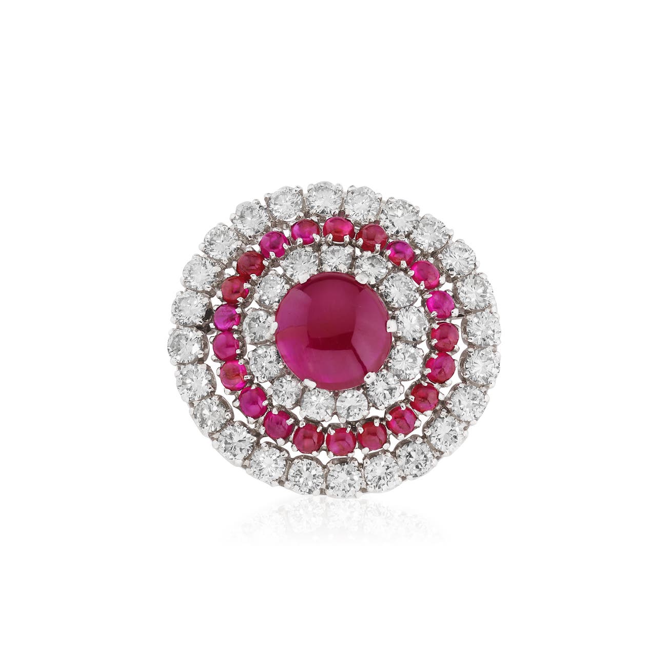 Set with a cabochon ruby, engraved with a crest of the Serra di Cassano family to the reverse, accented with a row of similarly-cut rubies, between two rows of brilliant-cut diamonds, measuring approximately 37 x 35mm, signed Chantecler.