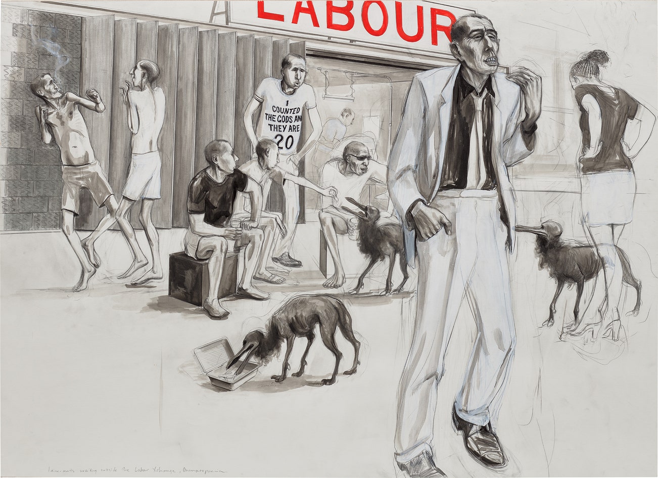 signed and dated 'charles avery 2012' lower center; inscribed 'Itinerants waiting outside the Labour Xchange, onomatopeia' lower left