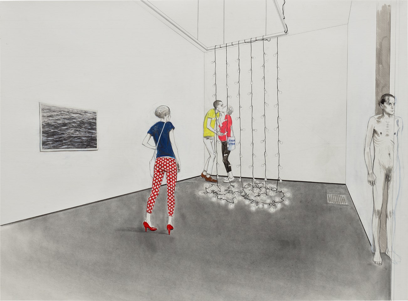 pencil, ink, acrylic, gouache and print on paper laid down on linen