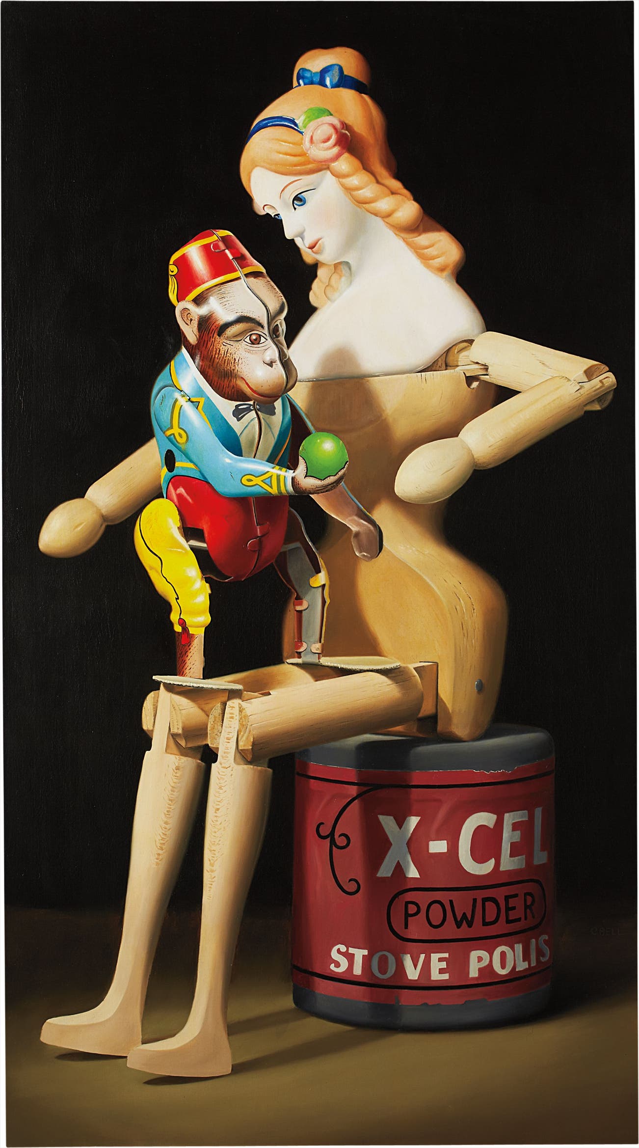The present lot, Untitled (Monkey & Doll), 1973, is exemplary of Bell’s undeniable engagement with realism and nostalgia. Here, the artist creates somewhat of a fantasy, bringing the familiar to life, anthropomorphized children’s toys, bathed in light against a dark background, engaged in a quiet tender moment. Bell’s oeuvre can be categorized into three periods according to subject; his toys, gumball machines, and pinball machines. The present lot, Untitled (Monkey & Doll), stems from his first series of toys, from which the artist’s famed Seaplane in Bathtub, 1972, emerged as a meditation of perspective and refractions of light. Certainly, Bell sought to bring pictorial majesty and wonder to the mundane. The present lot was noted by the artist as his Pieta, suggesting a direct association between composition and chiaroscuro effect: “For myself, choosing subjects is definitely an emotional process rather than an intellectual exercise.” (Charles Bell, in L.K. Meisel, "Charles Bell", Photo-realism, New York: Harry N. Abrams, 2008, p.55-56)