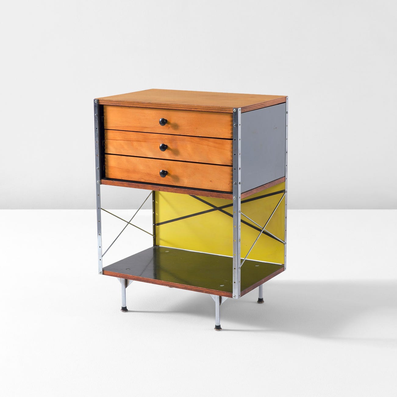 Manufactured by Herman Miller Furniture Company, Zeeland, Michigan. Inside of drawer with manufacturer's paper label printed herman miller/furniture company/zeeland/michigan and DESIGNED BY/CHARLES EAMES.