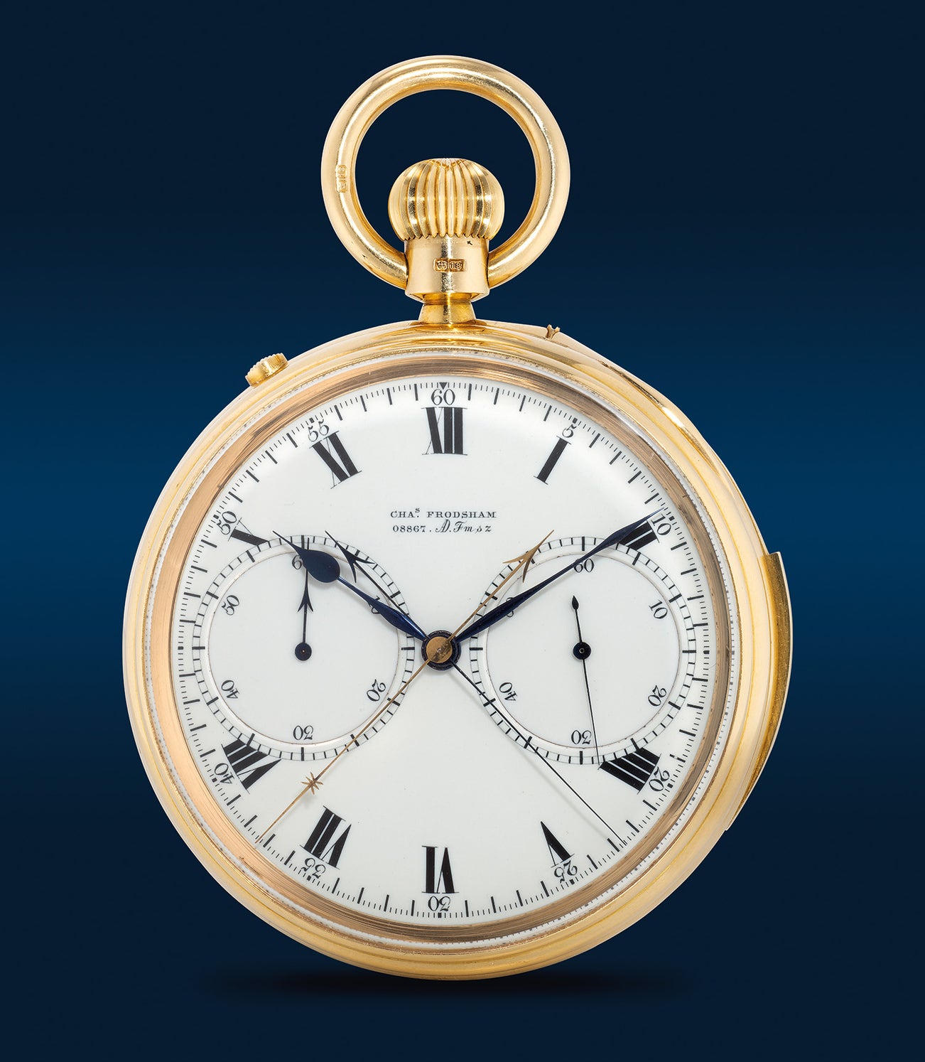 An extremely well-preserved, attractive and important yellow gold minute repeating split-seconds chronograph open-faced keyless pocket watch with one-minute tourbillon, 60-minute register and enamel dial