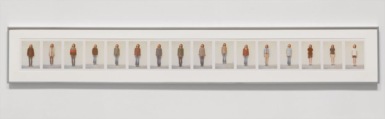 In the present lot, Charles Ray presents a series of documentary Polaroid photographs starring himself as the subject, modeling the various outfits in his wardrobe. Aptly titled All My Clothes, this work challenges the traditional notion of the self-portrait. Despite being the centerpiece of each image, his own self is largely indiscernible, making the subject more so Ray’s attire than the artist himself. Each image is taken from a straight-on angle, his planted feet meeting the exact point of the horizon line where the white wall and gray floor intersect. From this vantage point, we are unable to decipher Ray’s facial expressions, making the only differentiating factor from one image to the next the outfit he’s fashioning. The Los Angeles-based sculptor and conceptual artist has explored the subject of clothing in many of his sculptural and media projects, including a later film entitled Fashions from 1996, featuring Ray’s friend and fellow artist Frances Stark modeling 100 different outfits. This focus on material objects is present throughout Ray’s oeuvre, demonstrating the artist’s interest in redefining the readymade concept in the postmodern era. In the present lot, his contemporary interpretation of the readymade involves not only everyday objects, but also the carrier of these objects: his own body. By stripping himself of any identity, the artist showcases his preoccupation with the effect of material objects on humans, presenting Ray as a victim to his own wardrobe in images which, in turn end up looking more like mug shots than fine art portraits. Through this aesthetic decision, Ray makes the overarching statement that we are all victims of a materialist culture, driven by consumerist desires and a lack of individuality