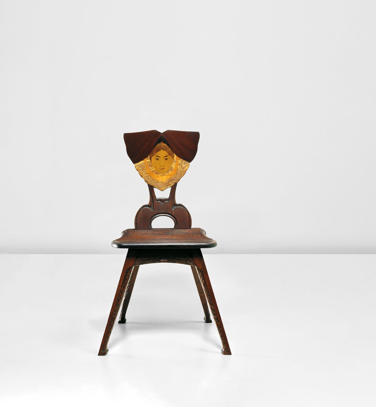 Alsation artist and craftsman Charles Spindler designed the present model chair for the dining room in the German section at the 1902 International Exhibition of Modern Decorative Art, Turin. Born in 1865, in Bœrsch in the region of Alsace, Spindler studied painting and design in Germany, before opening his own workshop in Saint-Léonard, a small village near Strasbourg. In 1893, Spindler began creating pictures using marquetry. He soon integrated his marquetry into furniture designs, which featured an extensive range of woods selected for their different colours and grains. The present chair illustrates Spindler’s mastery in the technique, which he applied to a vernacular chair form. In 1900 at the Paris International Exhibition, Spindler won the German Grand Prix and French Silver medal for his designs for a music room, which included a settle and panelling now held in the collection of the Victoria & Albert Museum, London.