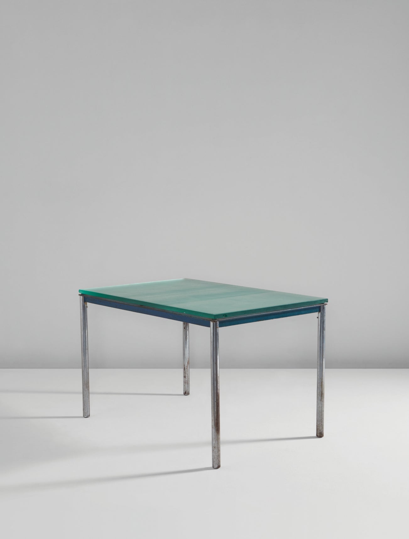 At the Salon d’Automne of 1929, Charlotte Perriand, Pierre Jeanneret, and Le Corbusier liberally used glass and metal in order to reflect Le Corbusier’s idea of the house as “a machine for living in.” Their investment in mechanization went beyond the employment of industrial materials in their furniture: the designers, particularly Perriand, worked with Thonet to mass-produce the moveable pieces designed for the 1929 Salon. The goal of this collaboration was to make modern furniture more accessible to the public, and Perriand, Jeanneret, and Le Corbusier hoped to spread good design to those who could not afford their show pieces. Ironically, the B307 table and the eight other works in the series were the most expensive objects in Thonet’s catalog. Between 1930 and 1935, only 535 B307 tables were made, and by 1937 Thonet stopped production on the Salon d’Automne commission.