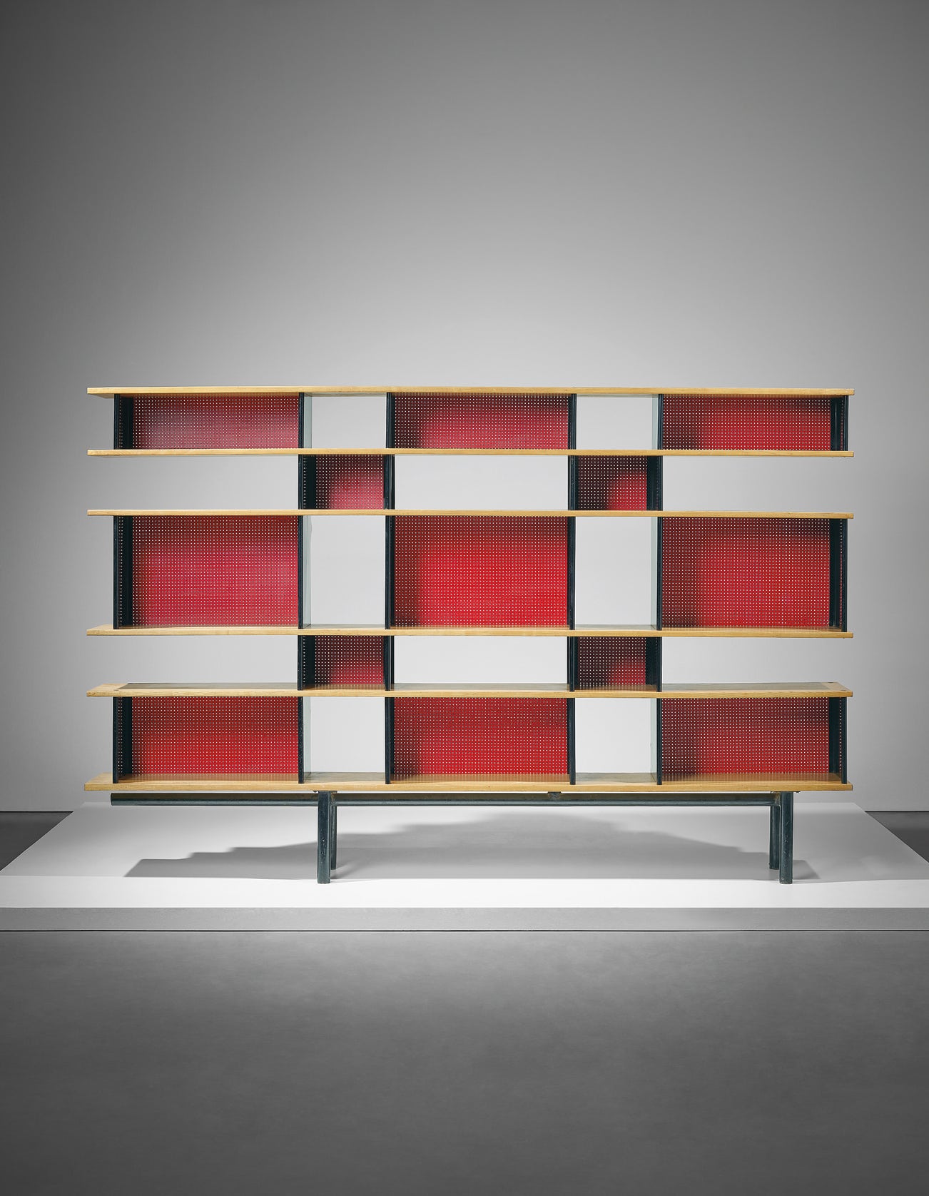 Demonstrating a considered analysis of both the subject and object, Perriand designed the ‘Antony’ bookcase in response to a student’s day-to-day gestures and needs within their living space. She based the dimensions of the bookcase on precise measurements of the objects she anticipated students would store in the units and the overall proportions of the room. The resulting design created a series of voids within the small inhabited volume. Enhancing the visual composition of the bookcase’s punctuated shelving, Perriand used red perforated hardboard for the back panels. The structural system Perriand designed using two lateral panels and a separate back allowed for potential variation in the width of the shelves, in addition to the benefit of flat transport for assembly onsite. Softening the precise lines of the black-painted steel, the bookcase’s horizontal ash veneer shelving lent an element of warmth, creating a balance between natural and machine-made materials within students’ living space. The compositional structure of the ‘Antony’ bookcase illustrates Perriand’s approach to bring together standardised elements, enhancing the adaptability of her designs which she could re-imagine in response to the requirements of a specific project and its inhabitants.