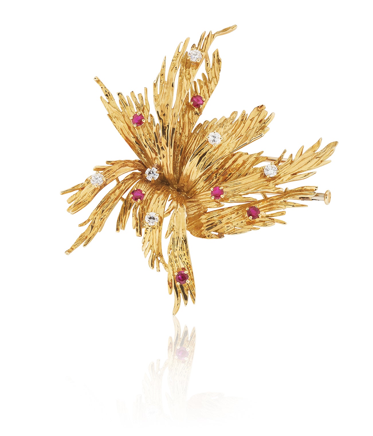 Of spray design set with circular-cut rubies and diamonds, measuring approximately 65 x 65mm, signed Chaumet, French maker's mark for Chaumet, assay marks for gold.