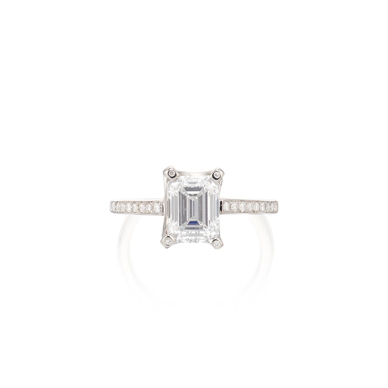 Set with a step-cut diamond weighing approximately 1.51 carats, to the brilliant-cut diamond shoulders, mounted in platinum, signed Chaumet, size 5, case stamped Chaumet.