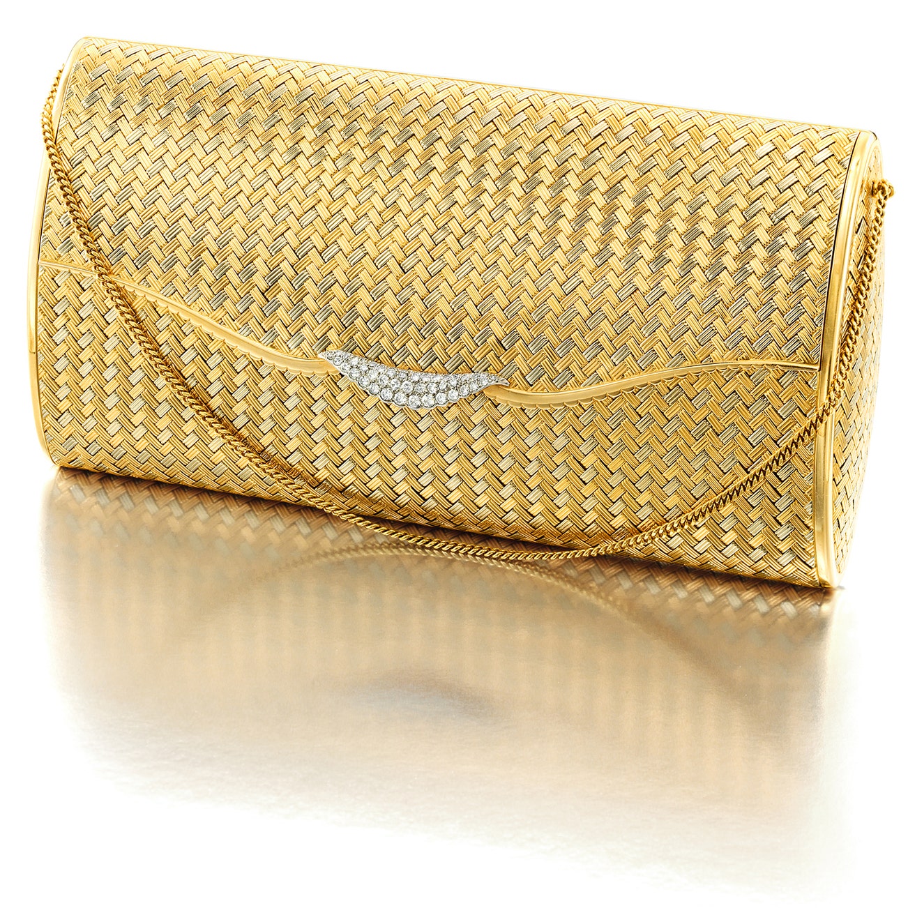 Of woven design and rectangular shape, the hinged flap enhanced with circular-cut diamonds, opening to reveal a fitted mirror, attached with the gold chain, mounted in 18K gold, measuring approximately 6 3/4 x 3 1/2 x 1 1/4 inches, signed Chaumet Paris.