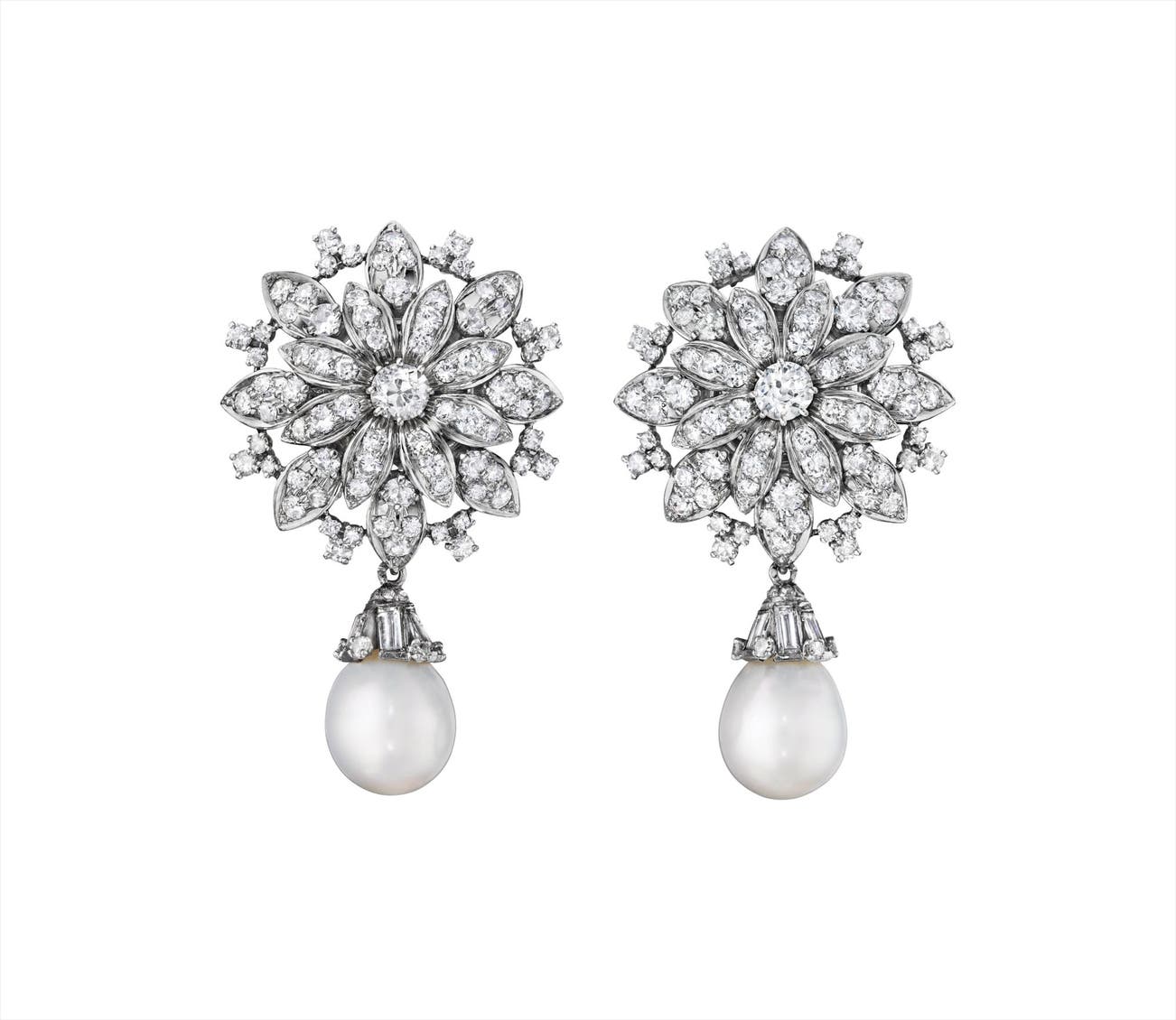 Each designed as a circular-cut diamond flowerhead surmount, suspending a drop-shaped cultured pearl measuring approximately 12.5 mm, enhanced by a rectangular and circular-cut diamond cap, mounted in platinum, length 2 inches, pendant is detachable.